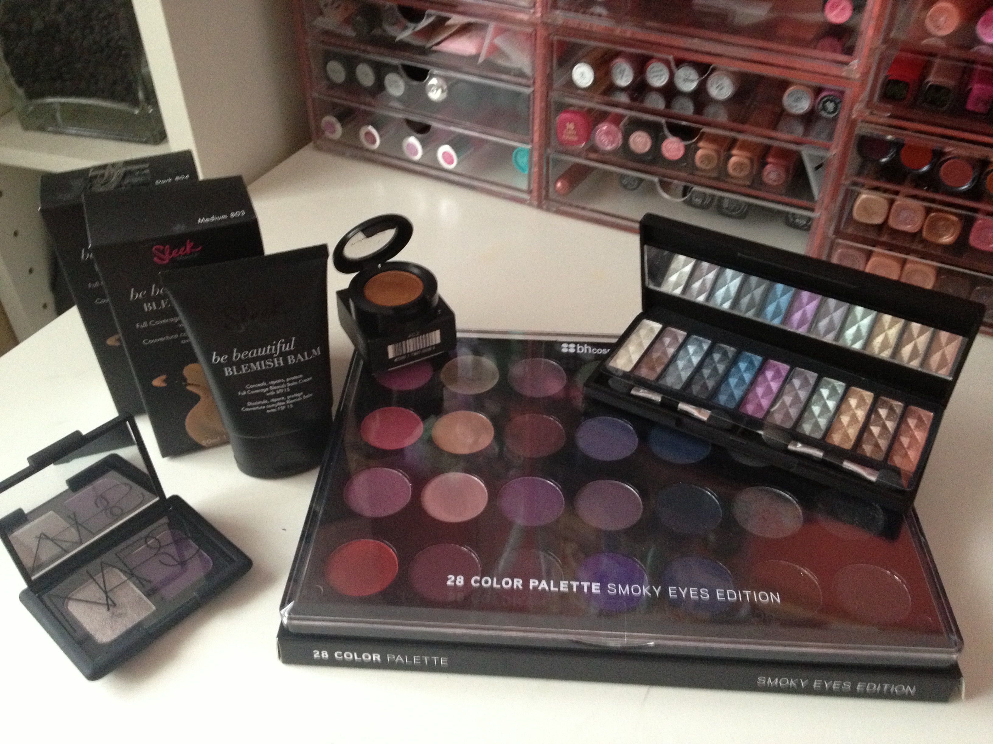 *NARS Melusine double eyeshadow / Sleek Beauty Balm (BB) in Medium / Sleek Beauty Balm (BB) in Dark/ Mac Eyeshadow Amber Lights (one of my faves) / BH Cosmetics 28 Colour Smoky Eyes Edition Palette / Mac Metalica Eye Shadow palette (limited edition).